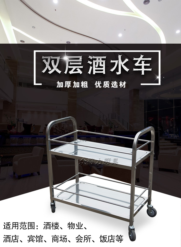 江西眾得力廚具有限公司生產銷售食品機械,商用廚具系列中央廚房設備,為客戶提供廚房整體解決方案。我司生產銷售的酒水車有大、中、小三種規格,采用201無磁不銹鋼設計。外形美觀大方,結實耐用。深受餐飲酒店客戶青睞